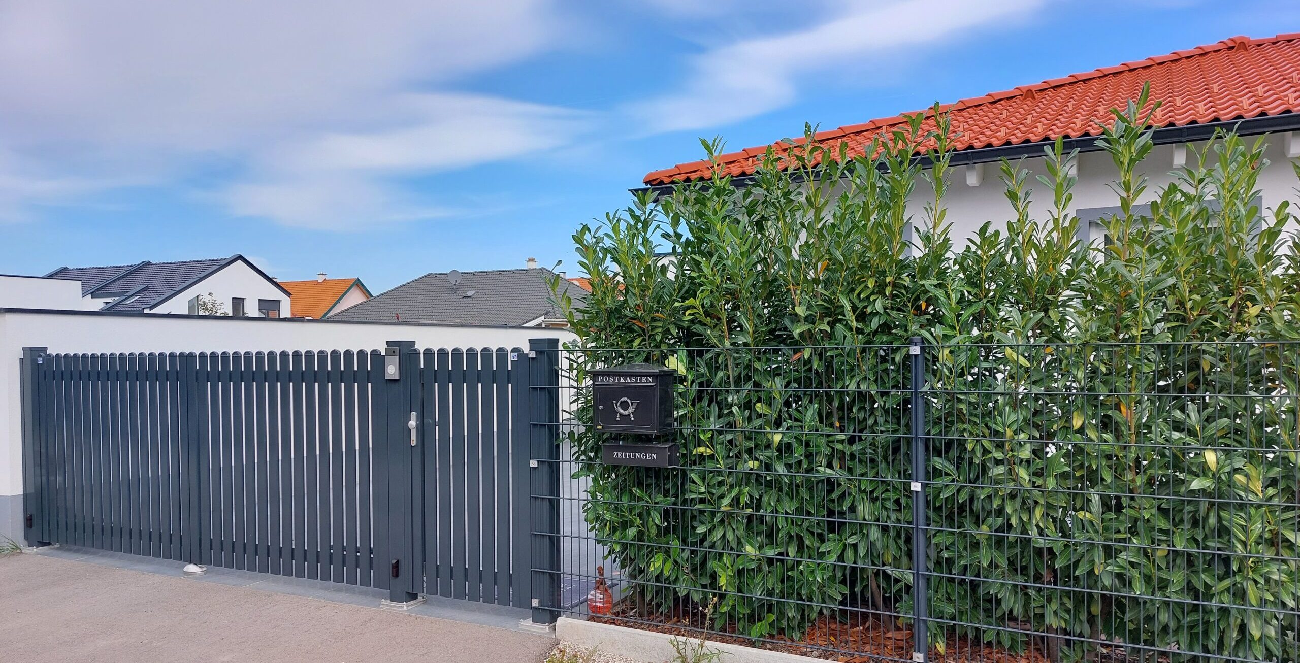 Ein schlichter Gittermattenzaun als Grundstücksabgrenzung kombiniert mit einem funktionalen Einfahrtstor aus pflegeleichten Aluminium, ebenfalls schlicht oder auffällig, ganz nach Ihren Vorstellungen!